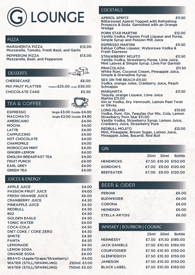 Step into G Lounge, Walthamstow's premier destination for an unforgettable shisha and dining experience. Whether you're winding down after a long day or kicking off your night with friends, our cozy and stylish atmosphere is perfect for any occasion.